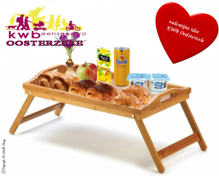 KWB Oosterzele organiseert een ‘Valentijnsontbijt’ op zondag 10 februari. Het ontbijtpakket wordt aan huis gebracht in Oosterzele en zijn deelgemeenten. In dat pakket zitten een croissant, boterkoek, chocoladekoek, fruitsap, chocomelk, yoghurt, appel, speculaas, melk en boter. Een pakket kost 7,5 euro. leden van KWB en hun huisgenoten krijgen 3 euro korting per persoon. Inschrijven kan tot en met zondag 3 februari bij