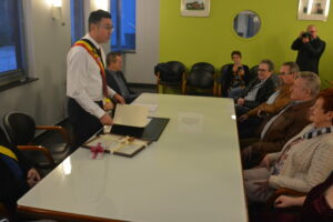 Bij deze gelegenheid werden de jubilarissen ontvangen op het gemeentehuis door de gemeentelijke overheid waar tevens de gebruikelijke geschenken werden overhandigd.
