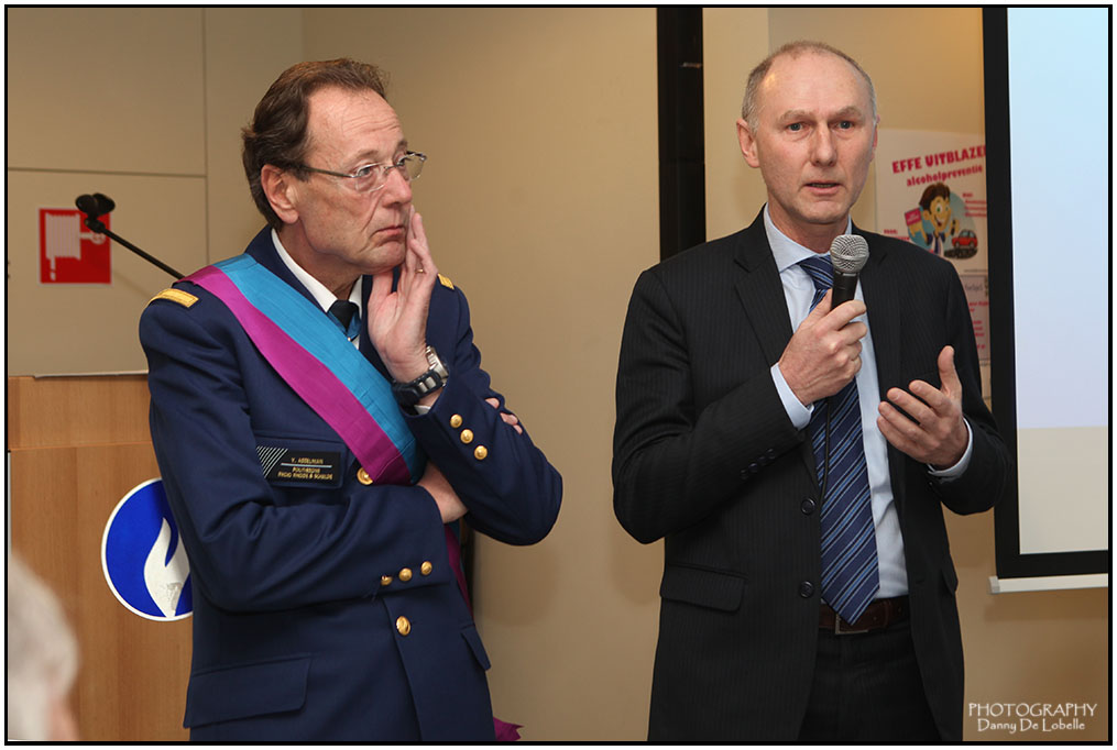 De nationale voorzitter Dhr. Maes Rudy en de nationale ondervoorzitter Dhr. Asselman Yves van de Koninklijke Maatschappij voor dragers van eretekens en medailles van Belgi ë, reikte een cheque uit van 2.300€ voor de VZW Kinderharten en Christoforus gemeenschap uit Munte.