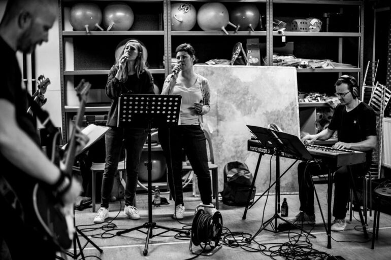 Jan : De zangeressen zijn Fien De Keyser en Griet Vergracht. Griet is leerkracht op de Heilig Hart campus zelf en Fien geeft les in het College in de Ooststraat. Beiden zijn naast leerkracht ook, zoals de meeste leden van de band, ouders van kindjes die school lopen op het Sint Barbara College. Het zijn twee fantastische zangeressen en bovendien heel fijne mensen om mee samen te werken.