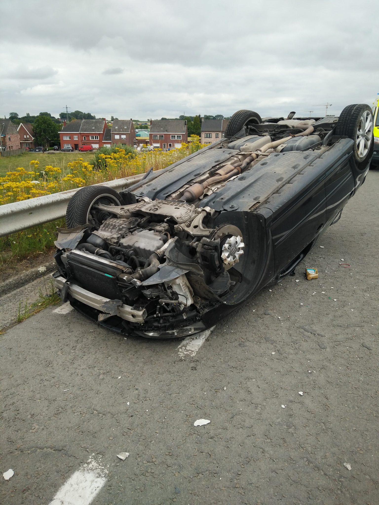 Vooraleer de wagen over de kop ging raakte hij een vangrail. Het is onduidelijk hoe het ongeval is gebeurd en of er een tweede wagen bij betrokken was. De bestuurder en zijn passagier kwamen er met de schrik vanaf. De wagen raakte zwaar beschadigd en lijkt rijp voor de schroot. Tijdens de takelwerken werd een van de twee rijstroken een tijdlang afgesloten.
