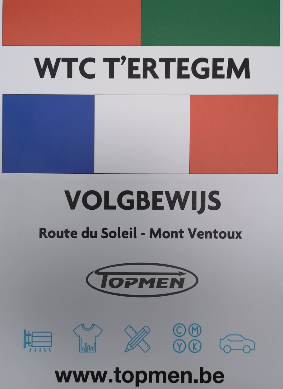 Per zullen ze zo’n 200 km afleggen. Bedoeling is zaterdag aan te komen. Zondag nemen ze een dagje rust en maandag rijden ze dan samen de Mont Ventoux op. “Ik denk dat het zal lukken, maar ik heb voor de zekerheid toch wat extra getraind”, aldus De Potter. De andere deelnemers: Robrecht Verlinden, Jimmy Bequ é, Ruben De Meyer, Tim Trossaert, Jenne De Potter, Jonas Haustraete, Paul De Clercq, Pascal Hubeau, Jo Monsecour, Kristof Monsecour en Wim Van den Berge. Het peloton van WTC T’Ertegem wordt gevolgd door een bestelwagen met voorraden. Slapen doen ze in hotels.