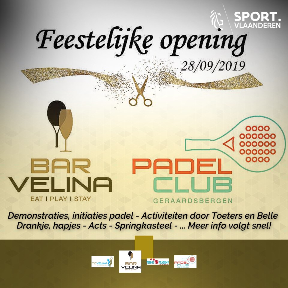 Op zaterdag 28/9 opent Nathan Samson, de nieuwe uitbater van Bar Velina, ook officieel zijn bar met enkele leuke acts. Met de opening van Padelclub Geraardsbergen, de opening van het nieuwe winterseizoen tennis en de opening van het vernieuwde squashterrein het ideale moment voor een openingsreceptie.