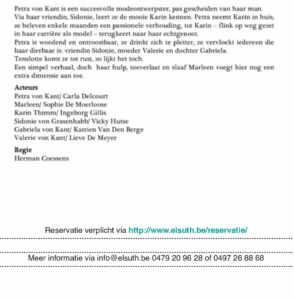 Cultuur·1 min lezenCo Essence en Elsuth brengen ‘De bittere tranen van Petra von Kant’ Voorstellingen volgend weekend 19 en 20 oktober in Michelbeke Bert Broos·12/10/2019·0·238 weergaves Er hebben twee opvoeringen plaats volgend weekend in Michelbeke. Door deze deelname van Elsuth uit Elst wordt hun jaarlijkse productie verhuisd naar maart 2020. Maak PDF van dit artikel