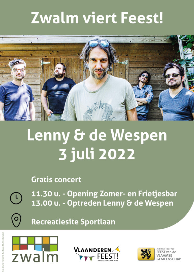 Op zondag 3 juli vieren we feest in Zwalm, samen met muziekband Lenny & de Wespen, want ook zij vieren feest voor hun 20-jarig bestaan. Bij mooi weer is het genieten van een minifestival op de recreatiesite (breng zeker je picknickdekentje mee). Als de weergoden dit niet toelaten, wordt het een gezellig miniconcert in de Zwalmparel. Het lokaal bestuur trakteert elke toeschouwer op een lekker pakje friet. Inschrijven is niet verplicht, maar aanmelden is wel handig. Dat kan je doen via https://www.zwalm.be/bestuur/nieuws/zwalm-feest-met-lenny-de-wespen.