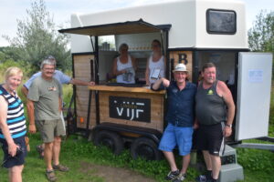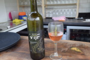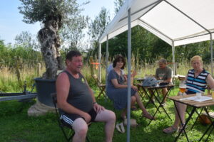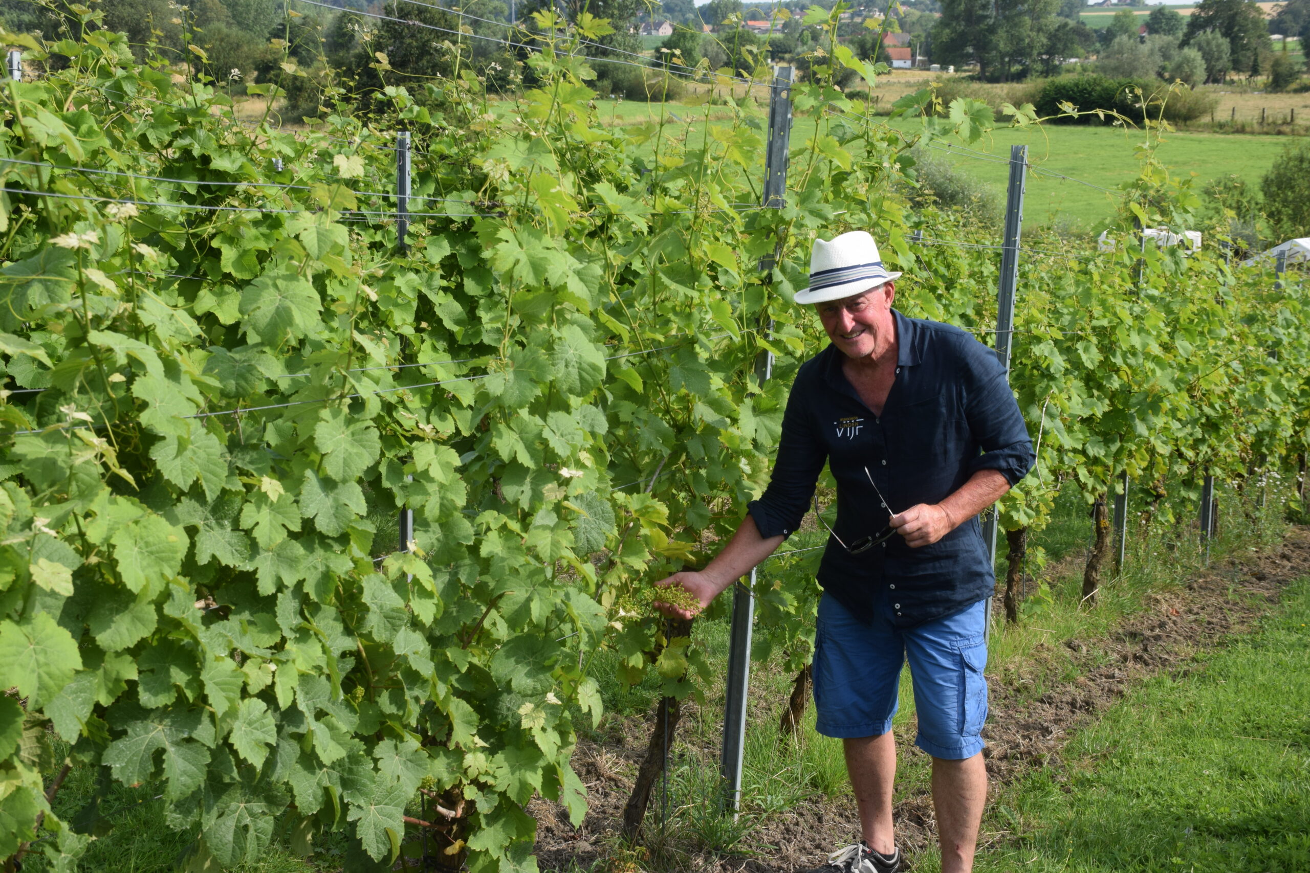 Zwalm – Wijndomein Vijflinden stelt deze zomer zijn wijngaard open met een gezellige outdoor zomerbar tussen de wijnranken. Naast eigen wijn van de wijngaard is er ook een aanbod van wijnen van collega’s, bieren en versnaperingen van lokale producenten. We waren zaterdag aanwezig in dit wijndomein. Danny Meuleman leidt ons rond en we zien dat sommige druiven serieus afzien door het natte voorjaar zoals de Reberger. “Andere druiven stellen het beter en moeten nu serieus gaan groeien om te kunnen oogsten in het tweede deel van september. Danny noemt het het één uit de hand gegroeide hobby.”