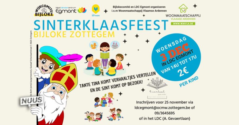 Op woensdag 3 december organiseren het Bijlokecomité en Lokaal Dienstencentrum Egmont, in samenwerking met Woonmaatschappij Vlaamse Ardennen, hun jaarlijkse Sinterklaasfeest. Afspraak van 14 tot 17 uur in het LDC. Ingang via de Arthur Gevaertlaan.