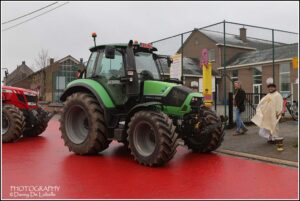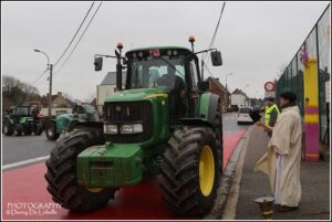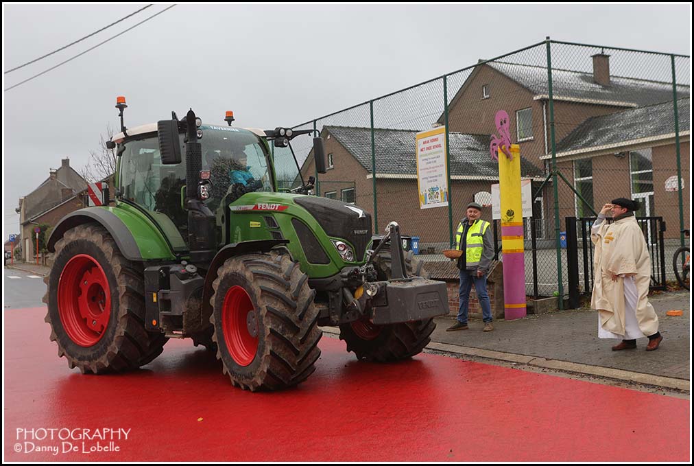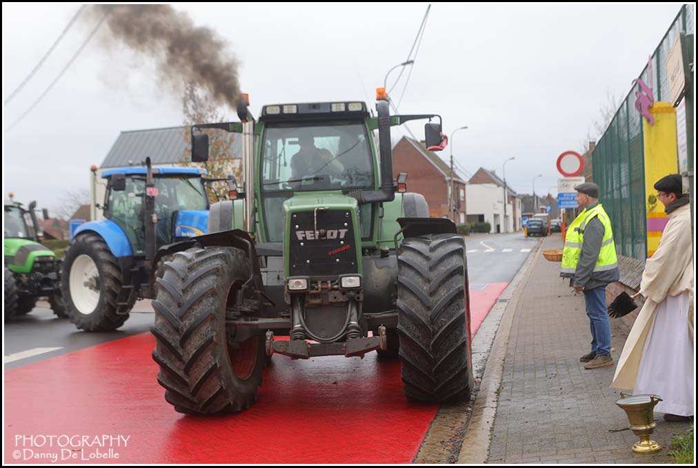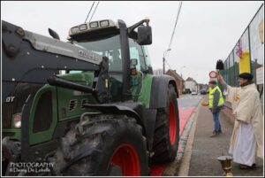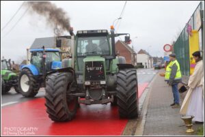 De actieve land en tuinbouwers verzamelden met hun tractoren om 10u30 voor een gebedsdienst voor overleden leden. De wijding gebeurde beneden de Pastorieberg door diaken Tom met aansluitend rondrit tot aan het Parochiaal Centrum waar het middag eten geserveerd werd. De Old timer vrienden “de oude wielen” leidde de 55 tractoren in goede banen.