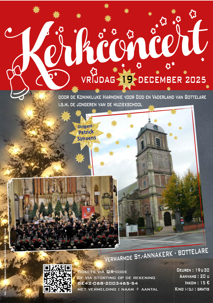 Op vrijdagavond 19 december is het weer tijd voor het jaarlijkse winterconcert van de Bottelaarse harmonie “Voor God en Vaderland”. De historische Sint-Annakerk van Bottelare word dan in een sfeervolle concertzaal omgetoverd. De muzikanten, aangevuld met het jeugdorkest van de eigen muziekschool, brengen onder leiding van dirigent Patrick Simoens een gevarieerd programma aangevuld met enkele kerstliedjes.