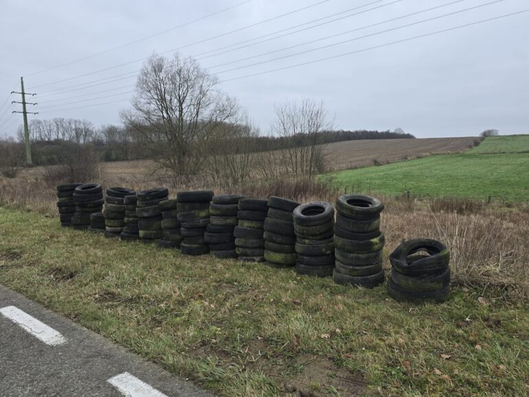 De zwerfvuiljagers stoten regelmatig op grote hoeveelheden afval langs de Geraardsbergse wegen, maar wat zij vier weken geleden in de Tabakslaan aantroffen, was uitzonderlijk. Niet minder dan 94 autobanden werden uit de grachten gehaald en op een rij langs de weg geplaatst. Sindsdien wachtten de vrijwilligers op een manier om het afval correct af te voeren.