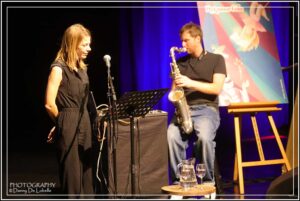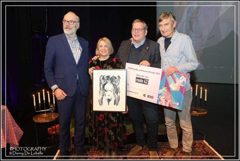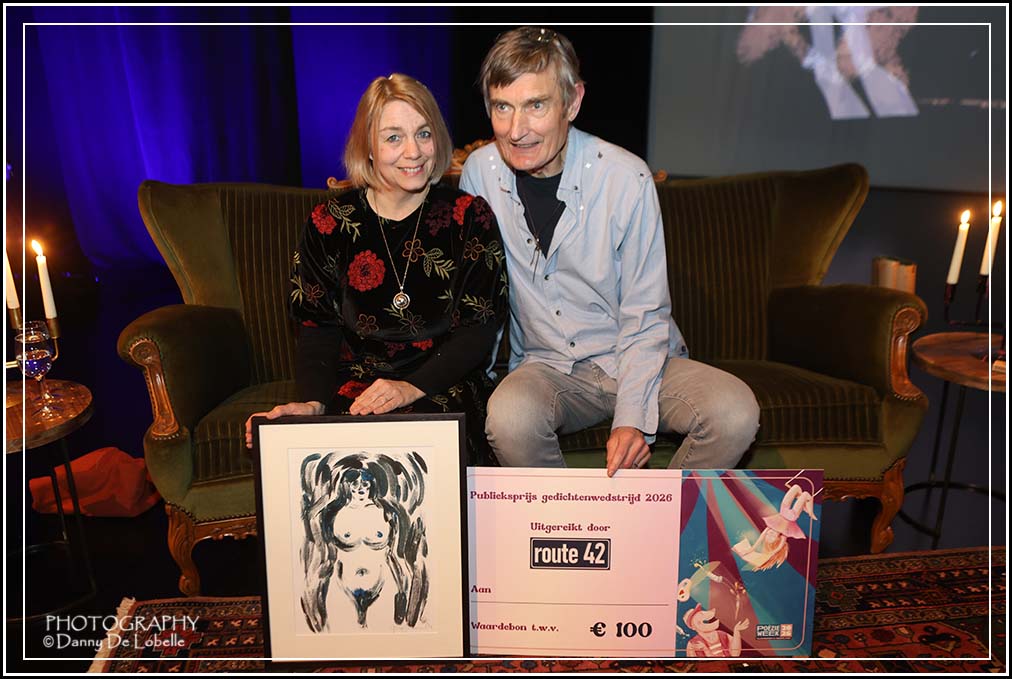 vlotte voordacht van de tien geselecteerde gedichten, live illustraties van Gerda Dendooven (wat een talent, kunst met grote K), knappe muzikale intermezzo van saxofonisten Nicolas Kummert en Gerik De Maertelaere, voordracht ‘Want straks komen de wolven’ door Liesbeth D’Hoker (iedereen hing aan haar lippen, sterke debuutbundel, met veel klasse en verve gebracht), uitreiking prijzen, interviews, en groepsfoto, werd de poëzieweek van Route 42 in stijl en klasse afgesloten. Veel lovende reacties voor de ronduit schitterende organisatie van het slotfeest van de poëzieweek van Route 42 en de tien gedichten die door de driekoppige jury Ruth Souffriau, Maaike Afschrift en Liesbeth D’Hoker uit een selectie van een zestigtal inzendingen werden geselecteerd.