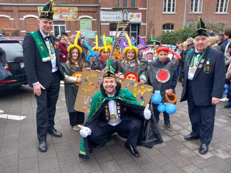Dit jaar was het wel een zeer speciale editie want niemand minder dan de kersverse Prins carnaval van Ninove, Prins Appel, liep mee in de stoet. Hij zorgde voor extra sfeer en ambiance in de straten van Zandbergen. “Op die manier kan ik al eens oefenen voor de stoet in Ninove” gaf hij ons mee. “Uiteraard ben ik er graag bij aangezien mijn kinderen hier ook naar school gaan”.