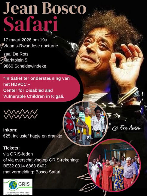 Op dinsdag 17 maart om 19.00 uur organiseert de GRIS Oosterzele (Gemeentelijke Raad voor Internationale Solidariteit) een bijzondere Vlaams-Rwandese nocturne in De Rots in Oosterzele. Centrale gast van de avond is singer-songwriter Jean Bosco Safari.