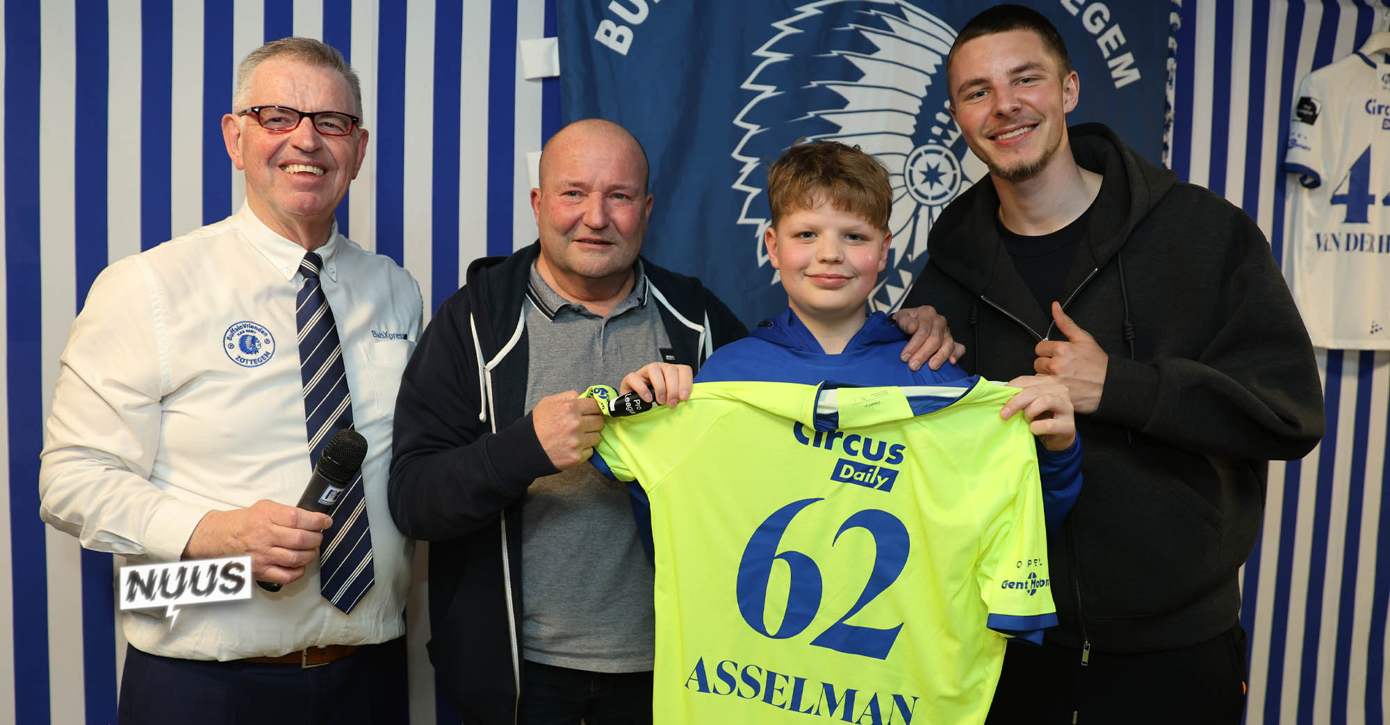 Beide voetballers werden woensdag uitgenodigd tijdens een gezellige gespreksavond in de kantine van Eendracht Elene Grotenberge. VRT-radiostem Tom Boudeweel leidde de gesprekken met naast Siebe Van der Heyden en Wout Asselman ook Tom Vandenbulcke, (communicatiemanager AA Gent), Guy De Rucyk (bestuurslid supporterfederatie) en Buffalo Ben (Benjamin Bundervoet, de mascotte van AA Gent). De voorzitter van Buffalovrienden Davy Van Droogenbroeck was fier om de spelers Siebe en Wout de oorkonde te laten ondertekenen en hen een mooie herinnering aan te bieden. Tussendoor zorgde de gekende accordeonist Johan Cockaert voor gezellige Gentse melodiën zoals ’t Vliegerke en Mia.