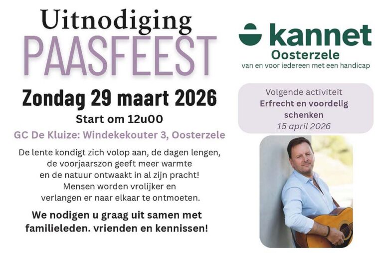 Op zondag 29 maart 2026 nodigt Kannet Oosterzele je om 12 u van harte uit in het Gemeenschapscentrum De Kluize, Sportstraat 3 in Scheldewindeke om deel te nemen aan het Paasfeest, ook dit keer wordt het een ronduit hartverwarmende bijeenkomst. Er wordt gestart met een bezinningsmoment. Nadien worden tomatencourgettesoep, runds cote à l’ os